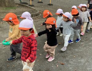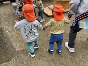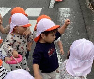 歩くのが安定してきた1歳児クラスの子ども達。お散歩は大人と手をつないで歩いたり誘導ロープにつかまりながら歩いています。秋の心地よい風に吹かれながら、散歩中に見る乗り物や人、風景を見ながら楽しんでいます。