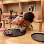 お花を作る玩具で遊んでいたお友だちの所に行き、お花の玩具を持って再び花瓶の所へ。