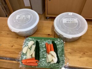 年長児が今年度育てたお米(玄米)とぬか床作りをして自分たちで漬けたぬか漬けの試食をしました。