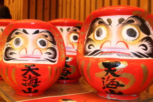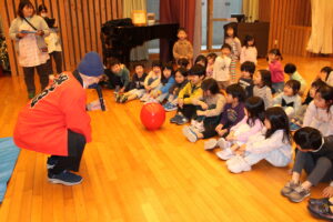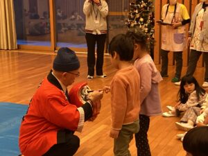 今日は「もちつき」がありました。足利理事長のお話と共に、代表のお友だちが1年間、見守ってくれた「だるま」に目入れを行いました。「だるまは何度転んでも起き上がる」というお話から、実際に足利理事長がだるまを転がしてみると、何度転がしてもだるまは起き上がり、子ども達からは「おぉ」と驚く声が挙がっていました。