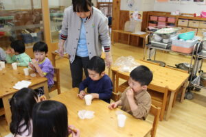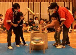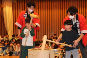 日本では昔からお祝いのときに餅を食べていたという風習があるそうです。稲からとれるお米は生命力を強めるとされており、とても大切に扱われていたようです。特に米をついて固めた餅は、その力が強いとされていたことから、お祝い事や特別な日にもちつきをするようになったと伝えられています。5歳児が代表で餅をつき、3・4歳児は拍手で応援しました。みんなで協力したことにより、立派な餅が出来上がりました。子ども達は「楽しかった」「重くて大変だった」と感じた事を言葉にしていました。この餅で鏡餅を作りエントランスにお供えをします。