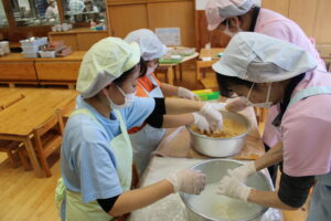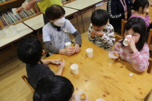 もちつきのあとは、餅の試食です。「いい香りがする」「おいしいね」と笑顔で食べていた子ども達です。