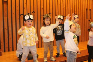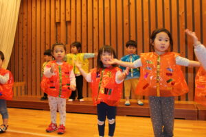 2歳児は衣装を身に付け気分もあがり、音楽に合わせてかけ声を言ったり踊ったりしていました。