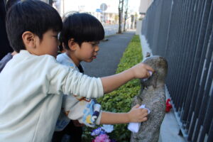 いつも見守ってくれているお地蔵さまに感謝の気持ちを持って丁寧にお掃除をしていました。