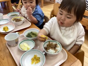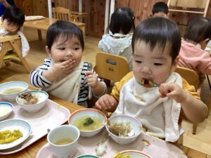 また給食では、かぼちゃサラダの提供がありました。かぼちゃは「ん」のつく食材で運を呼び込むと言われています。子ども達は笑顔を見せながら美味しそうに頬張っていました。