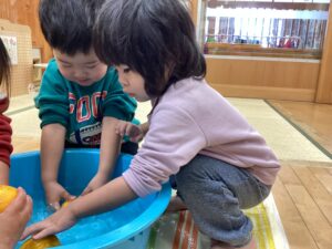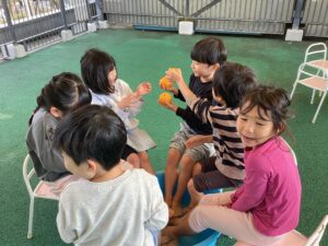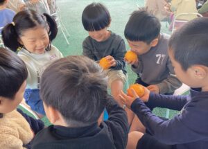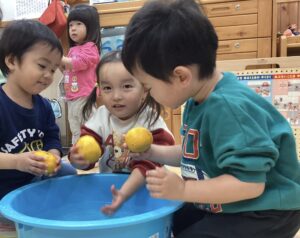 保育園では寒さに負けず、病気もせず元気に過ごせるように冬至に行うと良いとされる過ごし方を子どもたちと行いました。柚子に触れたり、柚子の匂いをかいだりして「良いにおい」「ミカンみたい」「つるつるする」と様々な感想を言っていた子ども達です。