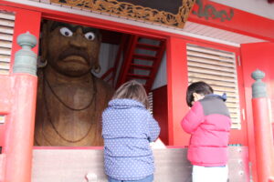 雲龍寺の五重塔の中にある大達磨。間近で見ると「すごくおおきい」「目が怖い」と達磨の迫力に圧倒されながらも、手を合わせていた子どもたちです。
