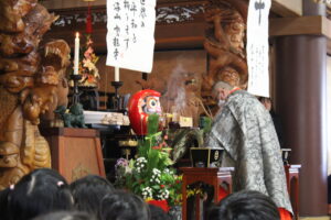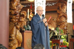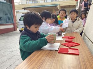 雲龍寺の住職から初詣についてのお話を聞き、園の代表としてみんなの健康を祈願しました。世の中で行われている戦争。光明の子は光の子。けんかをしないで世界が平和になるようにと、お話がありました。