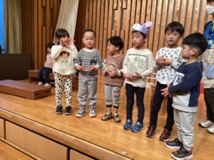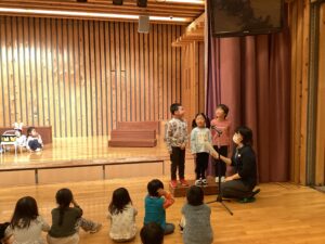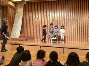 幼児組では遊戯会で発表する劇の練習が進み、本番で使う光明ホールでの練習も多くなってきました。