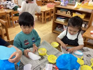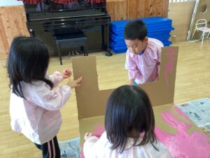 保育室では劇で使う衣装や道具作りも進んでいます。