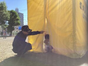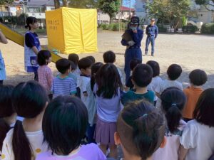 10月17日(金)は消防署から煙ハウスをお借りして幼児クラスを対象に煙体験をしました。