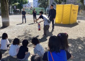 また職員は火事を想定し消火器を使用した消火訓練を行いました。子どもたちは「頑張れー」と言いながら応援してくれました。