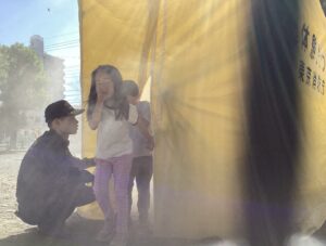 5~6人ずつ入りはぐれないよう前のお友だちの洋服をつかみ、口を押えながら低い姿勢でハウスの中に入りました。初めての煙体験で不安そうな顔も見られましたが、実際に体験すると「煙で前が全然見えなかった」「すごい煙だったね」など子どもたちは感じたことを言葉にしていました。