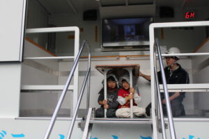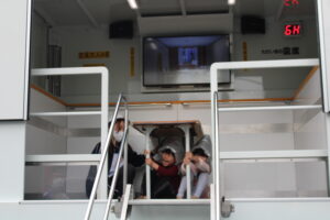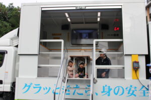 防災頭巾をかぶって起震車に乗り、机の脚をしっかり握って震度3から6までの揺れを体験しました。
