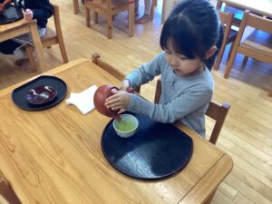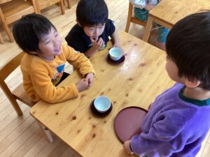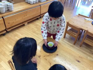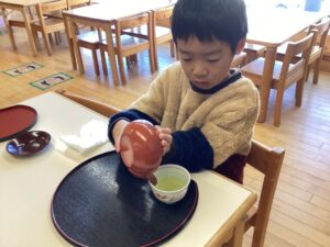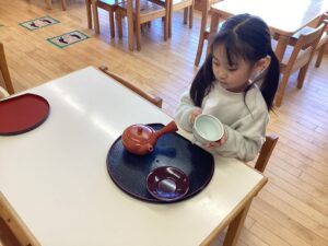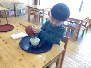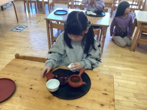 最初はぎこちなかった急須の持ち方も慣れてきて、上手にお茶を注ぐことが出来るようになってきました。